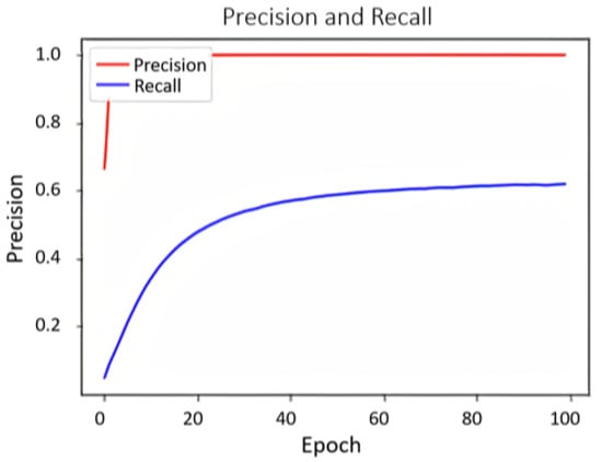 Figure 11 demonstrates the growth of precision and recall values throughout each epoch. The accuracy/recall graph of the ML-10M dataset has a structure similar to that shown in figure below. It was considered a threshold of 0.6 for both metrics. With these values and those of RMSE presented in Table 3, it can be deduced that the model is having a good behavior towards the data, thus being able to provide recommendations, more accurate, that go against the interest of the user.