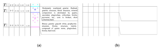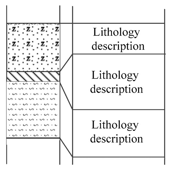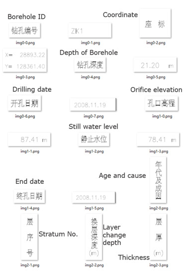 The description information in the borehole log is mainly the geological terminology of the text format. In order to improve the accuracy of description recognition, the Tesseract-OCR character library is trained by the geological terms in the same batch of borehole logs [27]. The Tesseract-OCR is imported in order to identify the graph. Before the character library is trained, the recognition rate is higher when the text is simpler for structures, such as “wind” and “chemical” Chinese characters. When the text structure is gradually complicated, the recognition effect gradually deteriorates, and the overall recognition rate is about 20%. After the character library is trained, the recognition of the text part is more accurate, but for punctuation marks such as “,”, and “.”, the recognition effect is poor. The overall recognition rate is 90%, and although it does not achieve a 100% correct rate, it greatly reduces the cost of manual extraction of information.