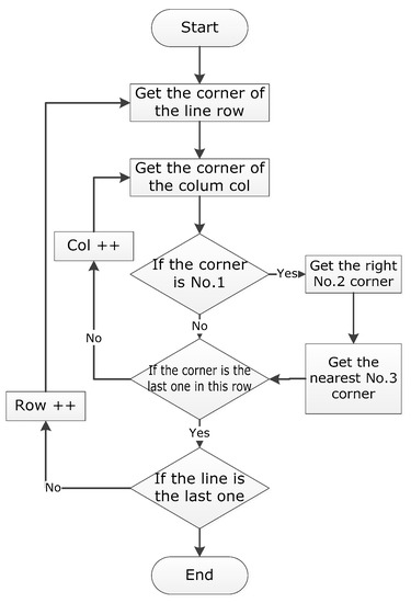 When locating a cell by triangular combination, all the (i, j) satisfying the formula should be obtained first, where the sign is a two-dimensional array that stores the intersections by rows. represents corner No.1 which is located in the j column and the i row; after determining k, which makes , there is no ∈; (j, k) makes and is nearest to corner No.2 on the right side of ; after determining l, r, which makes , there is no l’∈ (i, l), r’∈ N that satisfies . is the nearest corner No.4 mark which locates below ; corresponding cells are obtained by using the obtained combination of corner marks No.1, No.2, and No.4. By using the method of segmenting and judging cells (Figure 7) row by row, and column by column, serial rectangular cells (Figure 8) can finally be obtained.