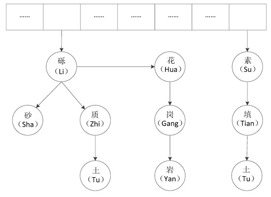 For example, the Chinese characters “Hua” and “Li” have the same index value after hash operation, and the chain address method is used to resolve the conflict. The “Li” node derives a node to store “Hua”, because “gravel” and “clay” have the same first node “gravel” and share the first node. As a result, a sub-tree is divided under the “gravel” node to store the subsequent text “clay”(Figure 11).