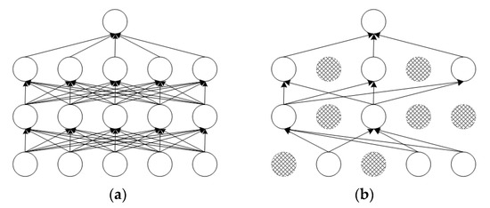 The structure of the dropout model. (a) Standard neural network; (b) a neural network using dropout.