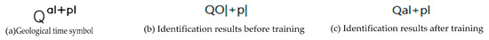 Because of the uniqueness of geological symbols and their appearance in a random column of the borehole log, training a unique geological symbol library for the column can improve the accuracy of the borehole log text recognition in the most efficient way [28]. As shown in Figure 13a, there are columns “ages and genesis” in the primary body, which are simply compared and tested. Figure 13b is the result of not using the training set, and Figure 13c shows the recognition effect of the training set obtained by extracting some parts of the geological symbols.