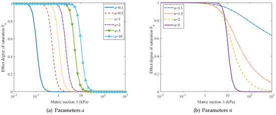 (a) The influence of parameters a on the soil–water characteristic curve (SWCC), and the n is 5 in this figure; (b) The influences of parameters n on the SWCC equation, and the a is 2 in this figure.