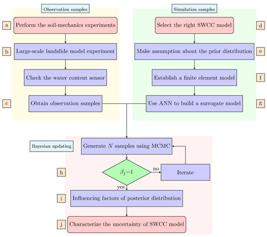 In this paper, the above-mentioned Bayesian updating method is used to calculate the SWCC model parameters. Bayesian updating is a method of statistical inference, in which as more evidence or information (in this paper is the observation samples) is obtained, Bayes’ theorem (Equation (2)) is used to update the probability of a hypothesis. First, the prior distribution of the SWCC model parameters is determined through reference research data or data from a SWCC experiment, as done in this work. Then, one uses the M–H method to generate a defined (large) number of random MCMC samples following a iterative calculation until = 1, and the posterior distribution is obtained. The M–H method is a powerful Markov chain method with which to simulate multivariate distributions. The main steps include initialization and iteration [34]. Figure 2 shows a flowchart for implementation of the proposed Bayesian approach schematically. The work done covers both the experimental results to feed the model (left branch on Figure 2), and the analysis methodology (right branch on Figure 2). The experimental data were obtained after basic soil mechanical experiments, to characterize the material of the landslide body, and a large-scale landslide model experiment, including water content sensors to measure in real-time the hydrodynamic process. The setup and results of the experiments are described in Section 4 and Section 5. Each step and its detailed description are summarized as follows.