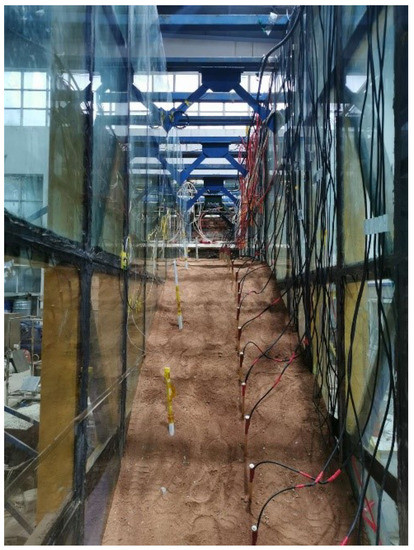 The experiments have been carried out in a large-scale landslide model experiment at The Key Laboratory of Geological Hazards and the Ministry of Education of the Three Gorges Reservoir Area of the Three Gorges University (China); the setup is shown in Figure 3. The model test platform was 6 m long, 0.8 m wide, and 1.5 m high. The door at the right end of the test platform could control the rise and fall of the reservoir water level. The landslide model was connected to external water supply pipes and drainage pipes. The speed at which the water level of the reservoir changed was adjusted by setting a flow valve.