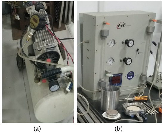 According to the nature of the landslide body in the Three Gorges reservoir area, the material of the landslide body was designed. The material used in the landslide body was composed of soil and small stones, and the ratio was 7:3. The landslide model test was completed according to the principle of landslide model forming. Considering the size of the model and the need to embed sensors, it was decided to choose the tamping method to build the landslide model. The sensors were embedded in the model in advance. The moisture content sensors were arranged in four sections, with 3 sensors in each section. Then we increased the water level of the reservoir to monitor the change of its water content. The overall landslide model is shown in Figure 4. In this figure, instruments for displacement monitoring and high-density electrical methods are included (the results are not used in this article.) In order to obtain the material parameters of the landslide model, a triaxial test and a constant head permeability coefficient experiment were carried out. A pressure plate instrument was used to obtain the characteristic curve of unsaturated soil water, as shown in Figure 5a,b. In this figure, the pressure pump and pressure plate instruments are displayed.