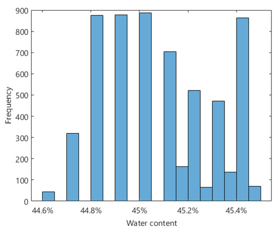Sensors were used to obtain water content data in real time. Figure 6a shows the water content sensor. The power supply voltage of the sensor was 5 V, and the output signal type was RS485. The monitoring data of the water content sensor were saved when the water level was from 0.3 to 1 m. Figure 6b shows the sensor data interface. Its function was to convert RS485 signals into USB signals. Based on the Modbus protocol, the data acquisition software was developed using C# to save the water content data to the database. All sensors conducted data sampling and recording every 10 s. Figure 7 is a histogram representation of moisture sensor monitoring data. In this figure, the abscissa represents different moisture content, and the ordinate represents its frequency. These water content data were used as observation samples in Bayesian updating (specifically, as shown in Figure 2).