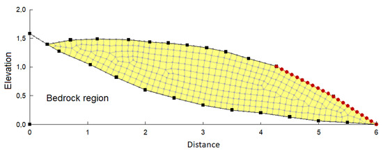In the FE model process, the main steps are to establish a landslide model, set material parameters, divide calculation units, and set boundary conditions [35]. Firstly, SEEP/W was used for geometric modeling of the landslide model according to the dimensions in Figure 3. The material models and properties of the soil were put into saturated-unsaturated seepage model, defined with a seepage constitutive relationship requiring two functions: the permeability coefficient function and water content function (SWCC) [35]. In this process, the saturated permeability coefficient was set to , and the SWCC parameters were set according to the prior distribution. Figure 8 shows the geometric model and the mesh used in this work. In this figure, the yellow area represents the landslide body. The unit accuracy of the finite element mesh was set to 0.1 m. The red part represents the boundary conditions. Two boundary conditions were set for the numerical model based on water level changes: water level boundary conditions and pressure boundary conditions. The boundary conditions of the model were a key component of the numerical analysis, and the ability to control the boundary conditions was also a direct reason for the powerful numerical analysis. In this process, the calculation method was the steady-state calculation, and the solver adopted the implicit solution method.