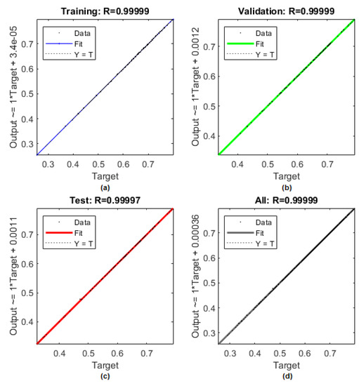 Neural network training regression: (a) The regression diagram of the 70% group of the training data; (b) The regression diagram of the 15% group of the validation data; (c) The regression diagram of the 15% group of test data; (d) The regression diagram of all data.