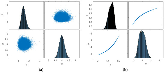 where is the probability density value at for a given set of parameters ; is the kth . is a set of parameters—in this analysis, the parameters a and n. In this process, the PDF should be estimated separately for each instance. However, in a complete Bayesian updating process, the required computation is costly, due to the large number of evaluations that are necessary to obtain to define a statistical sample.