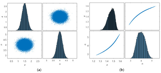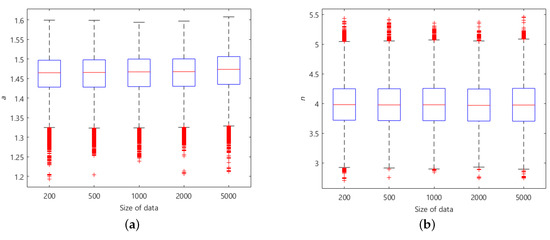 In order to study the changes in the posterior distribution when monitoring the increase in the amount of data, we used 200, 500, 1000, 2000, and 5000 sets of monitoring data to calculate the posterior distribution and analyze the results. As the amount of data increased, the trends of Bayesian updating results are shown in Figure 11, and the values of Bayesian updating results are shown in Table 2. In that figure, the red line represents the median, the upper and lower lines of the blue rectangle represent the upper and lower quartiles, the short red lines represent outliers, and the short black lines represent the minimum and maximum values. The trend of the change of parameter a is shown in Figure 11a. It can be seen that the median value of parameter a fluctuates around 1.46 and has a tendency to increase slightly. Outliers are distributed below the minimum value, indicating that the posterior distribution is left skewed. The trend of the change of parameter n is shown in Figure 11b. It can be seen that the median value of the parameter n fluctuated around 3.98. Outliers are distributed over the maximum value, indicating that the posterior distribution skewed right. When the number of data was 1000, the data of the posterior distribution were relatively stable. Therefore, in the following analysis, 1000 sets of observation data were used as samples to study the influence of the distribution type on the posterior distribution.