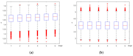 During the experiment (see Section 4.1 for details), we set the data collection time interval of the moisture content sensor to 10 s. When the water level changed from 0.3 m to 1 m, six stages were selected to study the trend of the posterior distribution of SWCC parameters when the water level changed. With the monitoring data obtained over time, the trend of Bayesian updating results is shown in Figure 13, and the value of Bayesian updating results is shown in Table 4. In this boxplot, the red line represents the median, the upper and lower lines of the blue rectangle represent the upper and lower quartiles, the red short lines represent the outliers, and the black short lines represent the minimum and maximum values. The trend of the change of parameter a is shown in Figure 13a. It can be seen that the median value of parameter a fluctuates around 1.47 and has a tendency to increase slightly. Outliers are distributed above the maximum value. The trend of the change of parameter n is shown in Figure 13b. It can be seen that the median value of parameter n fluctuates around 3.98 and has a slightly lower trend.