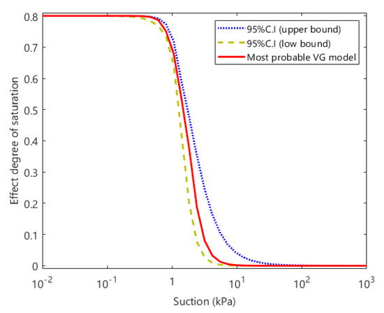 According to the previous results, it is possible to characterize the uncertainty of the model parameters. For a sufficiently large number of samples, and considering the minor effects caused by the selected prior distribution type and the time stage, the uncertainties obtained are reliable. Considering the VG model for the SWCC, the parameters a and n were evaluated with 100,000 MCMC samples and 95% confidence intervals (for 97.5% and 2.5% upper and lower bounds). The results are plotted on the curves in Figure 14. As can be seen in this figure, the most likely SWCC models were all within the 95% confidence interval. Therefore, the proposed method can reasonably determine the SWCC model based on limited experimental data and quantify the uncertainty of the SWCC model estimate.