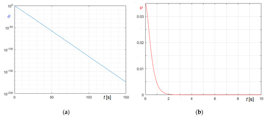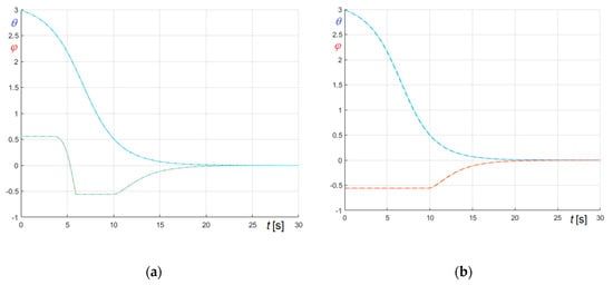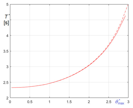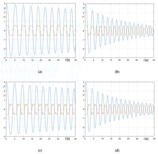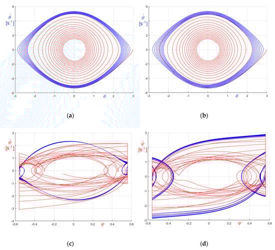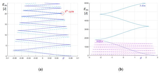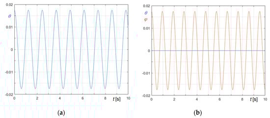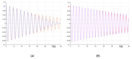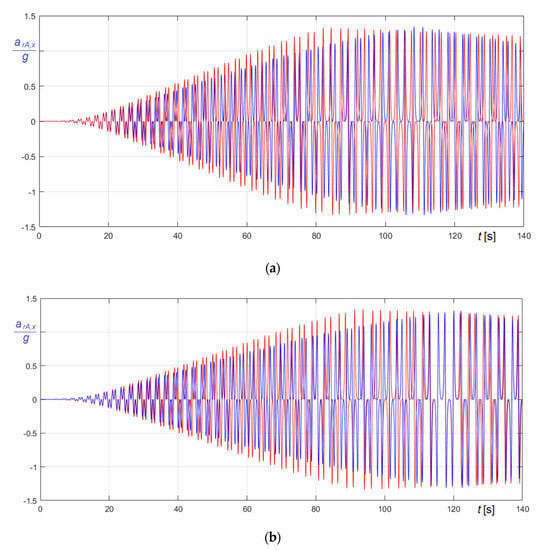 Relevant curves obtained in the undamped and in the friction damped case are compared in Figure 23, Figure 24 and Figure 25. In the figures, panel (a) refers to (Equation (74)), and panel (b) to (Equation (75)); curves referring to undamped case are generally in blue and curves referring to damped case are generally in red, except curves in Figure 23, whose colors are opposites.