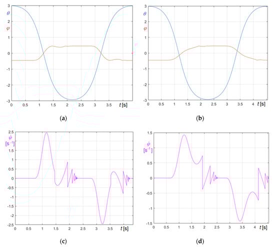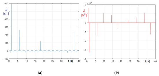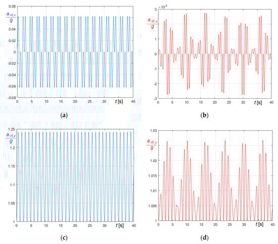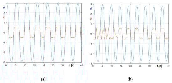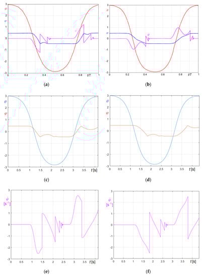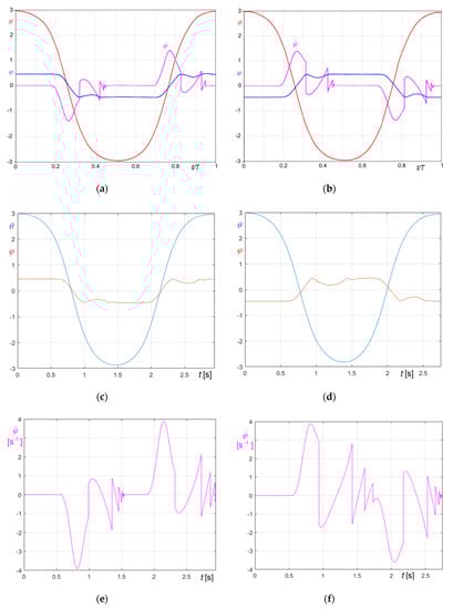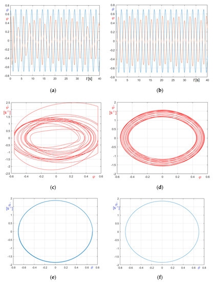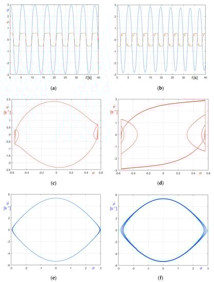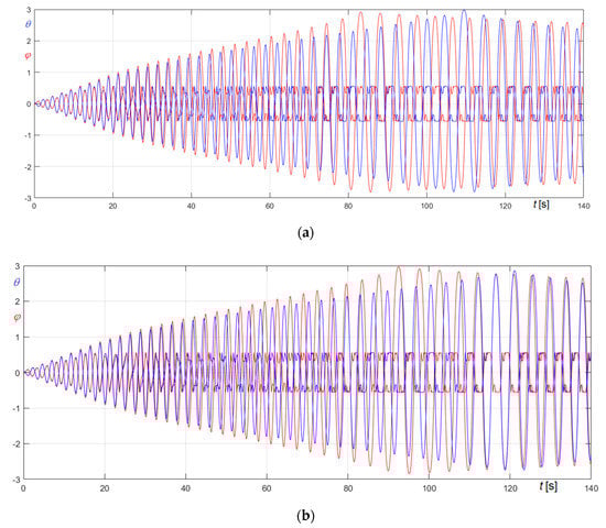 Obviously, Figure 27a refers to (Equation (74)), Figure 27b to (Equation (75)). The graphs clearly demonstrate that the period of the forcing frequency is automatically tuned on the period of the system, so certifying the capability of the proposed approach to simulate also constantly resonant excitations.