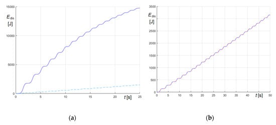 To complete the case study, the energy dissipated in the transient phase of forced damped oscillations are represented as a function of the time in Figure 28. In the figure, the blue line refers to and the red line to . The total energy dissipated to attain the maximum amplitude results , if the forcing function is , increasing to , if the forcing function is , so indicating that, as expected, excitation is more efficient.