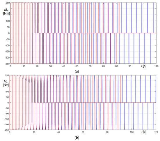 Comparison of time histories in the transient phase ( curves in red in the undamped case, in blue in the damped case; curves in blue in the undamped case, in red in the damped case): (a) forcing function (Equation (74)); (b) forcing function (Equation (75)).