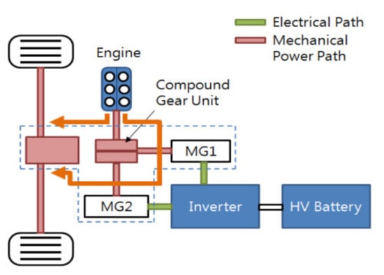 Figure 2 shows the main structure of the chosen hybrid electric test vehicle, where the internal combustion engine and two motors generate optimal driving torque and regenerative braking torque according to the driving situation. MG1 is a generator connected to the engine and supports MG2 through an inverter. MG2 uses the energy of the HEV battery to drive the vehicle. The engine and MG1/MG2 motors perform an optimized hybrid driving strategy by controlling the energy flow in conjunction with the compound gear unit.