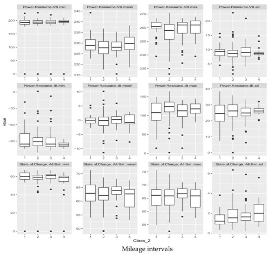Boxplot of VB, IB, SOC statistics according to mileage intervals.