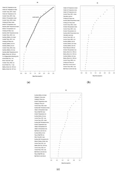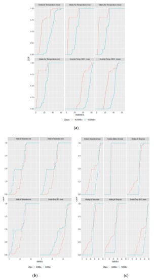 The cumulative distribution function (CDF) of major variables that exhibit a high Gini index so that the major changes are found within the intervals of 30,000–50,000, 50,000–60,000, and 60,000–70,000 km is displayed. The CDF plot illustrates how the values of a variable compose the entire dataset by displaying the cumulative density probability. Through the CDF plots, it can be observed how the features form the distribution. For example, the mean of the auxiliary battery voltages (denoted as Auxiliary.Battery.Vol.mean) has various values for 30,000 km, but a limited value near 14.4 for 50,000 km, which is higher than the value for 30,000 km. When comparing 30,000 and 50,000 km, major features exhibit much different distributions. The intake air temperature, ambient temperature, and inverter temperature show high skewness for 30,000 km, but the range of values increases for 50,000 km, as shown in Figure 6a.