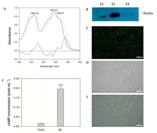 - Stierl, M.; Stumpf, P.; Udwari, D.; Gueta, R.; Hagedorn, R.; Losi, A.; Gärtner, W.; Petereit, L.; Efetova, M.; Schwarzel, M.; et al. Light modulation of cellular cAMP by a small bacterial photoactivated adenylyl cyclase, bPAC, of the soil bacterium Beggiatoa. J. Biol. Chem. 2011, 286, 1181–1188. [Google Scholar] [CrossRef]