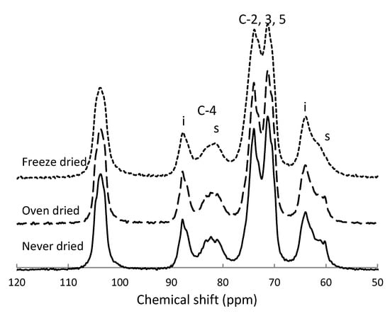 3.4. Evaluation of Drying Effect on Crystalline Structure Using 13C CPMAS Solid-State NMR Analysis