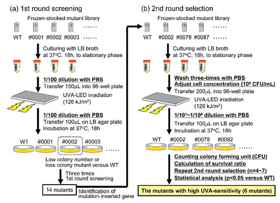 A transposon mutation kit, Ez-Tn5™ DHFR-1 Tnp Transposome kit (Epicentre Biotechnologies, Madison, WI, USA), was used in this study. After an 18-h culture in LB broth at 37 °C, the WT strain was diluted 20 times in LB broth containing 0.5% NaCl and cultured at 37 °C for an additional 2.5 h. The cells were collected by centrifugation (7740× g for 2 min) and washed three times with 1 mL of ice-cold electroporation (EP) buffer, containing 272 mM sucrose, 1.12 mM NaH2PO4, 5.88 mM NaHPO4, 1 mM MgCl2, and 7% dimethyl sulfoxide (DMSO). The cells were then suspended in 100 µL of EP buffer containing 1% TransposomeTM solution and 1% TypeOne™ Restriction Inhibitor (Epicentre Biotechnologies) at 4 °C for 10 min and transformed by EP using a Gene Pulse apparatus (Bio-Rad Laboratories, Hercules, CA, USA), at 1000 Ohms, 25 µF, and 1300 V. Following EP, the cells were transferred into 500 µL of LB broth containing 1% NaCl and incubated for 1.5 h at 37 °C. To isolate the Ez-Tn5™ DHFR-1 transposon mutants, the cells were incubated on LB agar containing 1% NaCl and 15 µg/mL trimethoprim (TMP) at 37 °C for 18 h. The isolated colonies were cultured individually with LB containing 3% NaCl and 15 µg/mL TMP and stored frozen in 8% glycerol. Mutants with high sensitivity to UVA were identified using a two-step screening process, as indicated in Figure 1. To identify the mutation-inserted genes, genomic DNA of the high UVA-sensitive mutants was purified using a QIAamp DNA mini kit (Qiagen, Valencia, CA, USA); the DNA sequences flanking the Ez-Tn5™ DHFR-1 transposon were evaluated according to the manufacturer’s instructions.