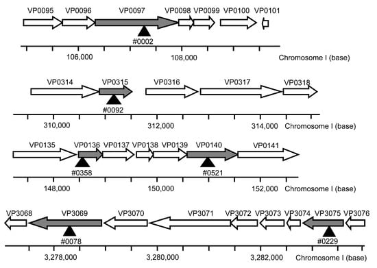 Map of Vibrio parahaemolyticus genes associated with the highly UVA-sensitive mutants. Arrows indicate open reading frames of V. parahaemolyticus genes. Arrow heads and gray arrows indicate mutant genes associated with high UVA sensitivity; the white arrows denote other genes with Ez-Tn5 DHFR-1-insertions.