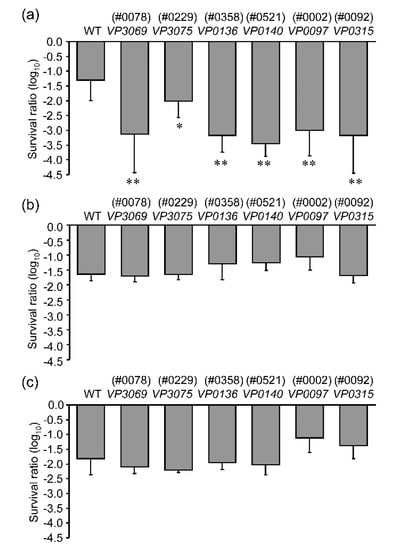 Sensitivities of six V. parahaemolyticus mutants to different wavelengths of UV light. (a) Responses to UVA-LED irradiation at 126 kJ/m2, (b) responses to UVB at 0.27 kJ/m2, (c) responses to UVC at 0.063 kJ/m2. The sensitivities to UV irradiation were presented as a logarithmic (log10) analysis of the survival ratio as described in the materials and methods. The detailed emission spectra of UVA-LED, UVB, and UVC are shown in Supplementary Material Figure S1. Values shown are means ± SD; n = 3–6, where n = number of independent replicates. * p < 0.05 or ** p < 0.01 versus WT.