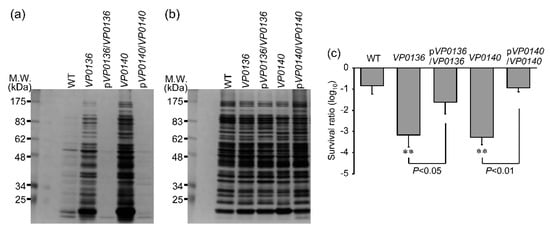 Extracellular and intracellular protein content and sensitivity to UVA irradiation among strains with mutations in genes association with general secretion pathways. (a,b) A typical image of protein content revealed by silver staining after SDS-PAGE. (a) Extracellular proteins and (b) intracellular proteins were separated as described in the materials and methods section. (c) Sensitivity to UVA irradiation, as shown in Figure 2a and Figure 3c. Sensitivities of gene-complemented strains of general secretion pathway genes, pVP0136/VP0136 and pVP0140//, were also evaluated. Values shown are means ± SD (n = 3–5, n = number of independent experimental replicates; ** p < 0.01 versus WT.