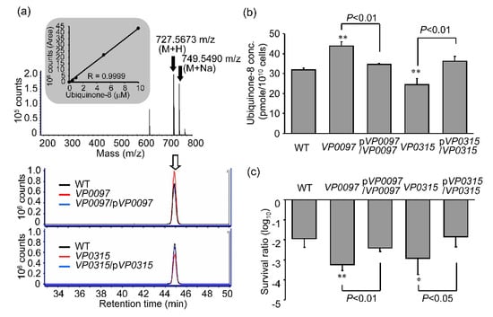 In E. coli and Vibrio spp., the UQ tail includes eight isoprene groups and as such is designated UQ-8 [24]. Biosynthesis of UQ-8 in E. coli relies on ubi genes [25]. In order to explore the relationship between sensitivity to UVA and mutations in genes responsible for ubiquinone biosynthesis, we measured intracellular concentrations of UQ-8 (C51H72O2) in VP0097 and VP0315 by LC-TOFMS. The positive ions associated with UQ-8 (mass-to-charge ratio [m/z] = 727.5673 [M + H] and 749.5490 [M + Na]) were detected at a retention time = 44.8 min (Figure 6a). We detected a lower concentration of UQ-8 in the VP0315 mutant than in the WT; interestingly, the VP0097 mutant exhibited a higher UQ-8 concentration than the WT (Figure 6a,b). The gene-complemented strains, pVP0097/VP0097 and pVP0315/VP0315, maintained levels of both the intracellular UQ-8 concentration and UVA sensitivity that were similar to the WT (Figure 6b,c). From these results, we conclude that both VP0097 and VP0315 serve to regulate UQ-8 concentrations and also the sensitivity to UVA irradiation.