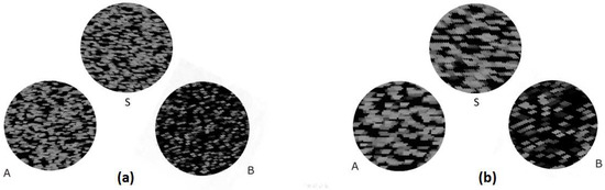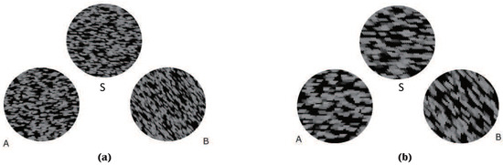 We synthesized the two other textures on the basis of the same idea as in the above synthesis procedure. The grains used for synthesis were the same as those in Figure 1a,e. However, the skeletons used for synthesizing two textures had the same directionality (with horizontal strength), but different density. The synthesized texture scenes were Scenes 3 and 4, as shown in Figure 3. The density of the skeleton was twice higher in Texture A than that in Texture B in Scenes 3 and 4. A total of four scenes were generated in this experiment (the synthesized textures are available for research upon request).