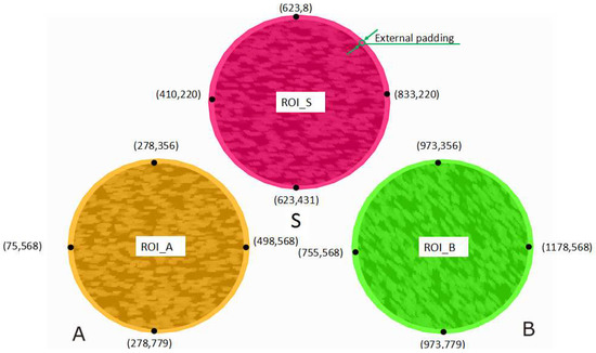 Before exporting the data from Tobii Studio [31], we divided each scene into three regions of interest (ROIs). In eye-tracking research, there is always disparity between a person’s actual gaze location and the location recorded by the eye-tracker [32,33]. The Tobii T60 eye-tracker has a reported accuracy of a 0.5 visual angle. Therefore, to eliminate the effect of systematic error, we took each texture and its external padding as one ROI. This strategy was adopted to avoid the problem of a participant viewing the edge of a texture and not being inside the ROI as a result of calibration issues.According to viewing distance, we calculated the external padding for different scenes. For Scenes 1 and 3, external padding was around 12 pixels. For Scenes 2 and 4, external padding was around 18 pixels. The size and location of the marked ROIs are shown in Figure 4.