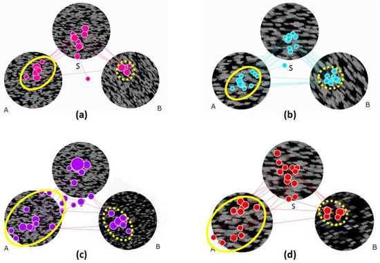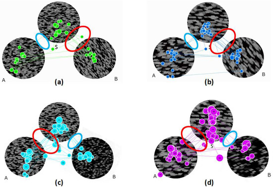 To verify the hypothesis, we conducted a paired t-test to evaluate differences in FTCs_S,A and FTCs_S,B for the similarity choice between Textures A and B in the four scenes. The independent variable used in the t-test was the FTCs between different ROIs under a certain finial similarity choice (Texture A or B). Results are shown in Table 3. For Scene 1, FTCs_S,A was significantly greater (in the paired t-test, t(16) = 4.883, p < 0.001) than FTCs_S,B when the similarity choice was Texture A. FTCs_S,A was much less (in the paired t-test, t(12) = −3.32, p = 0.006) than FTCs_S,B when the choice of similarity was Texture B. The same results were obtained in Scene 2. FTCs_S,A was significantly greater (in the paired t-test, t(11) = 2.966, p = 0.013) than FTCs_S,B when the similarity choice was Texture A. FTCs_S,A was considerably less (in the paired t-test, t(17) = −2.247, p = 0.038) than FTCs_S,B when the similarity choice was Texture B. In addition, in Scene 3, FTCs_S,A was significantly greater (in the paired t-test, t(23) = 6.075, p < 0.001) than FTCs_S,B when the similarity choice was Texture A. FTCs_S,A was much less (in the paired t-test, t(5) = −3.464, p = 0.018) than FTCs_S,B when the choice of similarity was Texture B. Lastly, in Scene 4, FTCs_S,A was significantly greater (in the paired t-test, t(16) = 3.289, p = 0.005) than FTCs_S,B when the similarity choice was Texture A. FTCs_S,A was less (in the paired t-test, t(12) = −2.241, p = 0.045) than FTCs_S,B when the choice of similarity was Texture B. Examples of FTCs for the four scenes are shown in Figure 6. On the basis of p- and Cohen’s d-values, analysis results verified the hypothesis that the final visual-similarity selection was related to FTCs between the different ROIs, and it influenced the fixation-transfer counts between different ROIs.