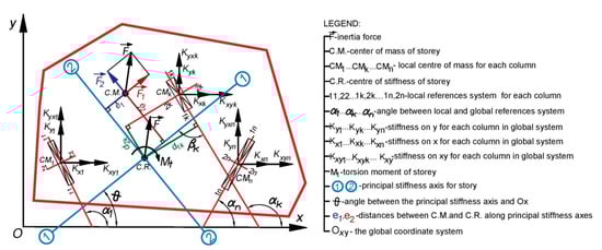 In this part, a general case is presented to show the main parameters used in the structural analysis. In the case of a multi-storey civil structure, the behaviour of all vertical structural elements is analysed between the nth floor and the (n−1)th floor, in the case of vertical regularity. In order to predict the behaviour of the structure, and to determine the elastic degrees of freedom, there is a point where the forces are reduced. Due to this analogy, the positions of the centre of mass (CM) and of the centre of stiffness (CS) may be determined.