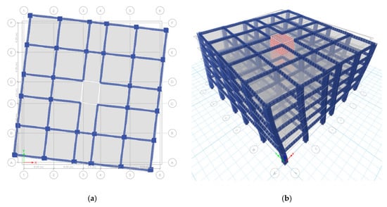 Firstly, it has to determine the values of the stiffness (), and one must consider and analyse every structural element corresponding to one storey. The number of the columns between the floors is denoted with . For this purpose, one chooses an arbitrary orthogonal reference system denoted with xOy relative to the floor, and another local reference system () corresponds to the cross-section of the column of the storey (located between two consecutive floors). The stiffness factor depends on the following: moment of inertia, the Young’s modulus of the material and the distance between two floors. The distance between floors and the material property are given due to the chosen structural system, so we are required to determine the moment of inertia corresponding to the floor. In the general case corresponding to an irregular shape of the floor’s section, one uses section meshing in order to obtain simple and regular geometric shapes. Steiner’s relations are used to determine the moment of inertia corresponding to each element of the storey. Then, one may compute the principal directions of inertia denoted with and corresponding to the section k of the element of the storey. The corresponding principal moments of inertia denoted with and , respectively, are also computed. Then, the principal rigidity factors of the cross section of the column of the floor are obtained, denoted with and , respectively. At this moment, the stiffness factors and are computed with respect to the local coordinate system .