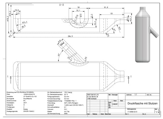 The pore density of a downscaled pressure vessel model component was investigated. For this purpose, a component design was developed, and two test components were LPBF-manufactured simultaneously. Figure 1 depicts a technical drawing of the experimental component.