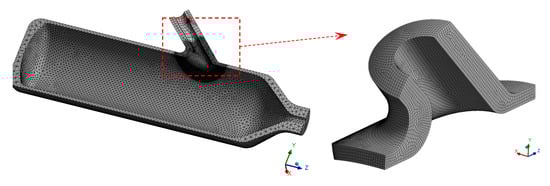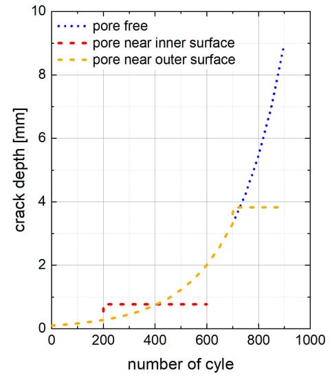 In the pore-free component (Figure 6a), the highest stresses appeared at the inner surface of the intersection. If there was a pore nearby (Figure 6b), the stresses at the pore edge were higher than at the inner surface. Therefore, the crack initiated from the pore. In the next step, the crack grew towards the highest stresses, which apart from the pore appeared at the inner surface. Only when the crack reached the inner surface did the crack growth direction turn from the pore towards the outer surface and the crack would grow into the depth of the wall [].