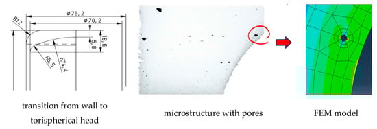 Therefore, the number of cycles until re-initiation of crack growth determines whether further crack growth is accelerated or retarded. In this context, pore distribution in the component is decisive (near or far from the surface, see Figure 4). For this purpose, the impact of pores in an exemplary component section (transition region from the cylinder wall to the torispherical head) under internal pressure loading was evaluated first. This region is characterized by high tensile stresses at the inner surface and compressive stresses at the outer surface.