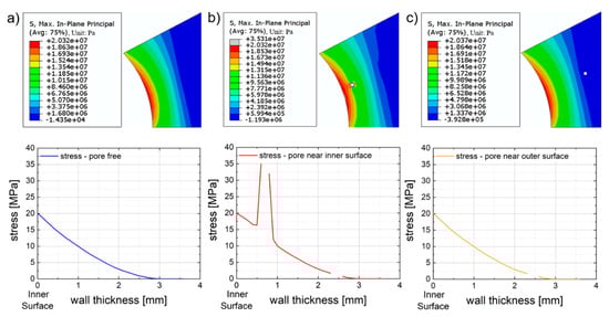 Stress distribution in (a) a pore free component, (b) a pore near the inner surface of the component, and (c) a pore near the outer surface of the component and through the wall (internal pressure 10 bar) [].