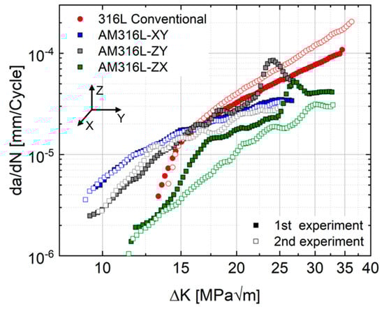 Nevertheless, several larger and elongated pores were found. Both ZY and XY specimens exhibited higher da/dN than the ZX sample (Figure 7). Accordingly, the measured crack length increased considerably faster with increasing number of load cycles (Figure 15).