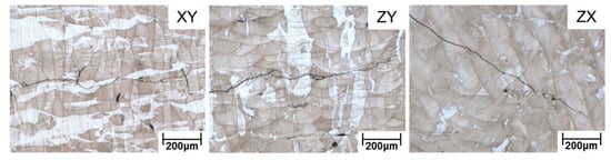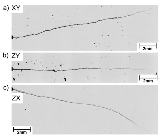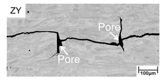 However, because both the curves of the ZY and XY specimens increased monotonically, it cannot be concluded that the pores were decisive for the higher crack propagation rate when compared to the almost pore-free ZX sample. Furthermore, a tendency of crack branching at pores of an aspect ratio of ~1.3–2.8 (Figure 14) was found in the ZY specimen. Material characterization thus confirmed the results of computational analysis of small pores, with a limited effect on crack growth (nevertheless, pores can act as crack initiators) [].