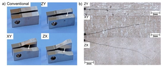 Figure 9a displays the CT specimens after fracture. Figure 9b depicts the crack paths in the LPBF-manufactured samples. In the XY direction specimen, the crack propagated perpendicular to the build direction, while in the ZY orientation, the crack propagated in parallel and in the ZX direction under an angle of 45° (cf. Figure 10). The lowest da/dN value, accompanied by the highest ΔK value to initiate crack propagation, was measured at the ZX sample. The best reproducibility was found in the XY direction specimens (Figure 7). However, only the ZY direction provided a valid fracture path (according to ASTM regulation []). Regardless of build direction, the crack path was transcrystalline (cf. Figure 9b, Figure 10 and Figure 11). Consequently, a weak connection of the individual melt pools can be excluded as a key factor in cracking behavior.