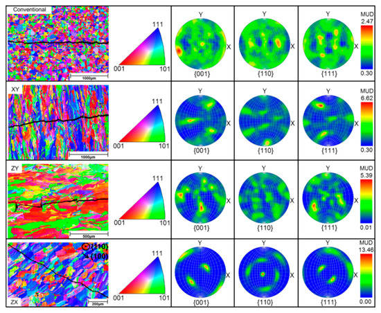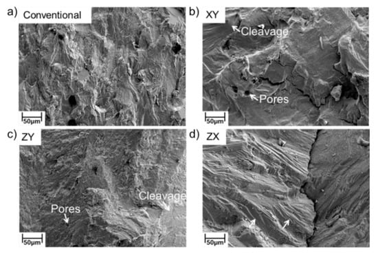 Figure 12 depicts the comparison of the fracture surfaces of conventionally and LPBF-manufactured specimens of different build directions. The fracture surface of conventionally produced material offered features of ductile fracture dimples. In contrast, a mixed fracture mode with ductile and cleavage areas, along with several pores, was found in the additively manufactured XY and ZY specimens (Figure 12b,c). The same was observed in the case of the ZX sample, but the crack propagated along lattice planes in the grain interiors (Figure 11d). In this specimen, preferred grain orientations into the {001}, {111}, and {110} directions were measured. With a percentage of 13.46%, the {110} direction was the dominating one (Figure 10). In contrast, the XY and ZY specimens exhibited preferred grain orientations into the {001} and {111} directions. Furthermore, preferential orientation relations in the XY and ZY were less significant than in the ZX specimen (cf. Figure 11).