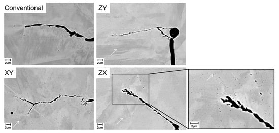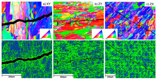 The grains were mainly found to be oriented into the building direction (cf. EBSD mappings in Figure 11). Corresponding to possible/preferred sliding systems in the fcc-lattice, the dislocation movement during cyclic loading took place in the direction of the oblonged grains (cf. local misorientation mappings in Figure 13). In the case of the XY and ZX specimens, dislocations were oriented perpendicular to the crack path (Figure 13a,c), resulting in an off-horizontal crack path (cf. Figure 9b). In contrast, the main crack propagated horizontally and the dislocations were oriented parallel (Figure 9b and Figure 13b) in the ZY specimen. Crack branching occurred at pores (detailed description included in Section 3.3) due to local stress concentration and changes in stress distribution. Secondary cracks grew partly perpendicular to the longer edges of the pores (Figure 14) before cracks were arrested by dislocations, running parallel to the crack (Figure 13b). Subsequently, the main crack continued to grow horizontally.