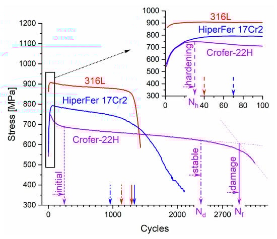 Because the stable stress range was lower, damage occurred later in Crofer22 H. Despite the high level of strain, obstruction in the experiments the S-N curves of Crofer22 H and HiperFer decreased moderately, especially in comparison to 316L. The austenitic steel strengthened in the hardening range by only 47 MPa, which corresponded to an increase in strength of only 5.4% (Table 6). 316L failed abruptly, with only a ≈13.8% damage range. With 29.9% of the lifetime in the damage range, HiperFer was found to be the superior material. Despite the fact that the effective strain range in the austenitic 316L steel (Δεth., i.e. Δεmech.HiperFer = 0.71%, while Δεmech.316 L = 1.14%), i.e., dislocation hardening, was much higher, HiperFer reached a comparably high stable stress range level.
