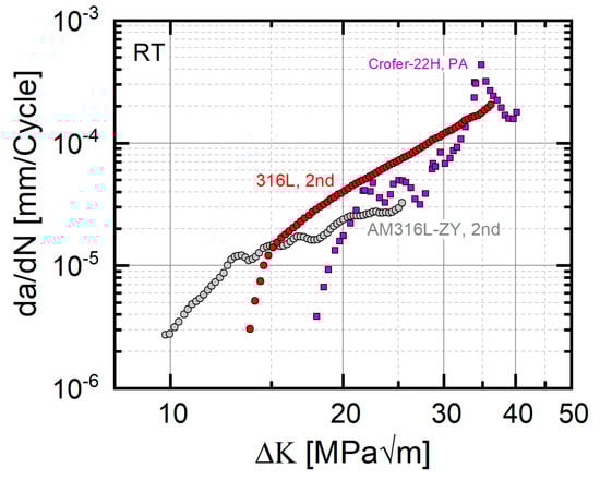 Cyclic crack propagation curves of additively manufactured 316L (AM316L-ZY), conventionally manufactured 316L, and Crofer22 H (after precipitation annealing: 0.5 to 10 h from 600–650 °C) at ambient temperature.