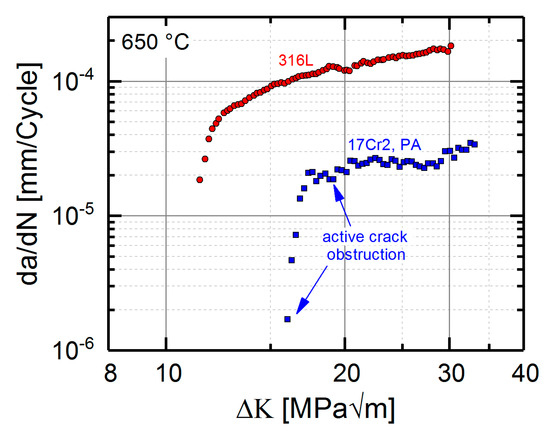 FCG data of 316L and HiperFer 17Cr2 (after precipitation annealing: 0.5 to 10 h from 600–650 °C) at 650 °C [].