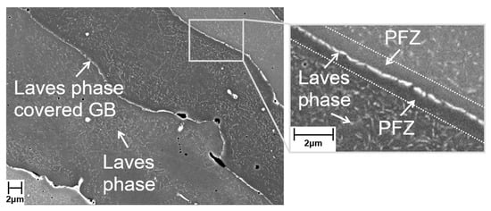 In addition, the grain boundaries were occupied by Laves phase particles (Figure 21) in the as-manufactured state, stabilizing the grain structure without embrittling the material. As outlined in [,], this is an important issue to enable profit from dynamic strengthening. Pores contained in additively manufactured materials (cf. Figure 21) acted as notches and led to accumulation of plastic strain in the surrounding material during cyclic loading. In HiperFerAM, this led to thermomechanically induced precipitation [,] of Laves phase particles at these dislocations and strengthened the surroundings of the pores and actively delayed crack initiation. Further microstructural characteristics of HiperFer were particle-covered high angle grain boundaries and the particle-free zones (PFZs [,,,]) that formed along these (Figure 21). Especially in higher tungsten-alloyed HiperFer, crack propagation through the densely particle populated grain interiors or to overcome the particle-covered grain boundaries is quite energy consuming.
