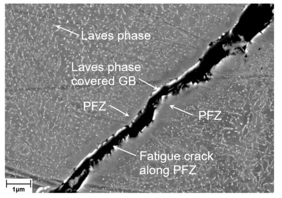 For this reason, cracks did not necessarily follow fatigue typical intragranular paths, but to some extent followed the PFZs (Figure 23). In consequence, crack growth could potentially be controlled by intelligent adjustment of PFZ width and grain size (i.e., particle-free volume).